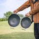 The foldable handle is shaped for confident grip and lets you reposition the pan safely when the heat is high — essential when cooking outdoors.